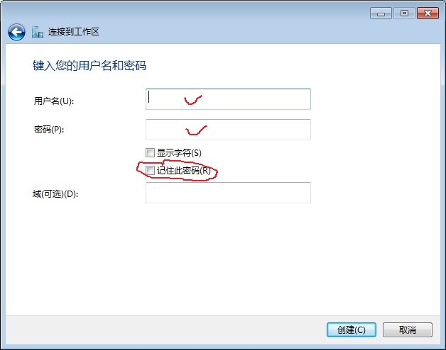 | 6.键入你的VPN用户名和密码,并选择"记住此密码",点击"创建" |