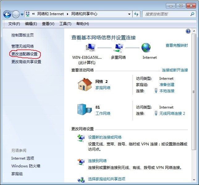| 8.重复"步骤1"进入控制面板,选择"查看网络状态和任务",选择"更改适配器配置" |