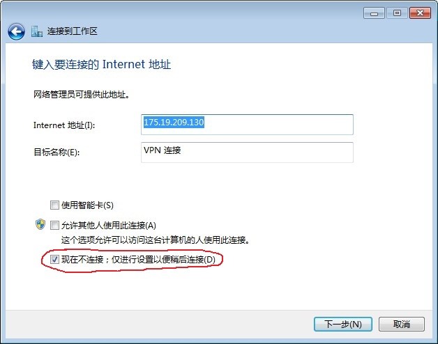 5.Internet地址填写:175.19.209.130 目标名称:可以随意填写 在最后一行"现在不连接;仅进行设置以便稍后连接"前面打√,下一步 |