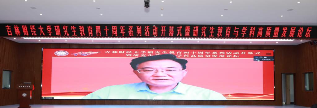 本网讯(研究生学院 供稿)7月16日上午,我校研究生教育四十周年系列活动开幕式暨研究生教育与学科高质量发展论坛在新经济(数字经济)创新创业实训中心报告厅召开。吉林省教育厅一级巡视员战高峰,东北财经大学教授王维国、复旦大学教授张金清、中国人民大学教授赵彦云、吉林大学教授胡亮、山西财经大学教授吴秋生、浙江工商大学教授黄溶冰等专家学者,吉林大学副校长蔡立东、中国科学院东北地理与农业生态研究所党委书记,所长姜明、东北师范大学副院长秦春生、吉林农业大学校长杜锐、长春中医药大学校长冷向阳、长春工业大学校长张明耀、吉林建筑大学校长陈雷、长春师范大学校长王延明、长春大学校长韩业、长春工程学院校长陈权、吉林工商学院校长张越杰、吉林艺术学院校长苏威、吉林体育学院校长邵桂华、吉林外国语大学校长秦和、吉林工程技术师范学院副校长刘克平等省内高校和科研院所领导,学校原党委书记、长春财经学院校长金硕和原校长、吉林省科学技术协会副主席张晶莹,学校首批硕士毕业生于长春出席大会。学校全体校领导,校学术委员会委员,校学位评定委员会委员,全体研究生导师,各部门、各单位负责同志参加了开幕式。会议由党委副书记、校长童猛主持。