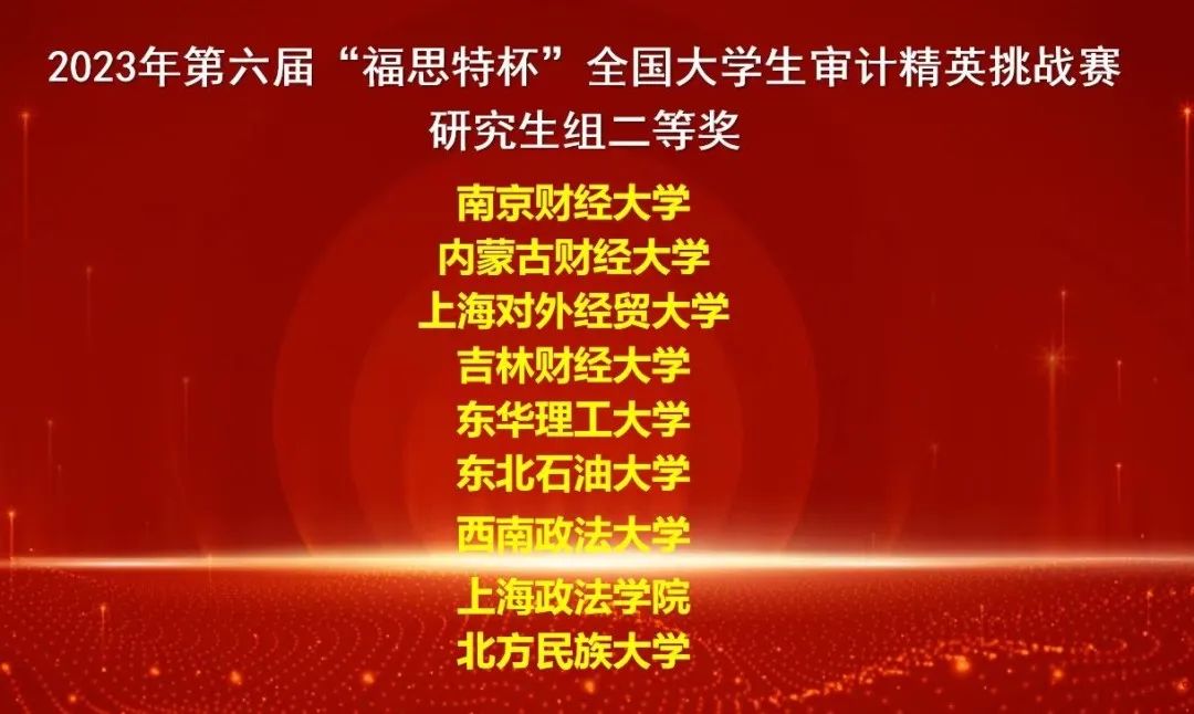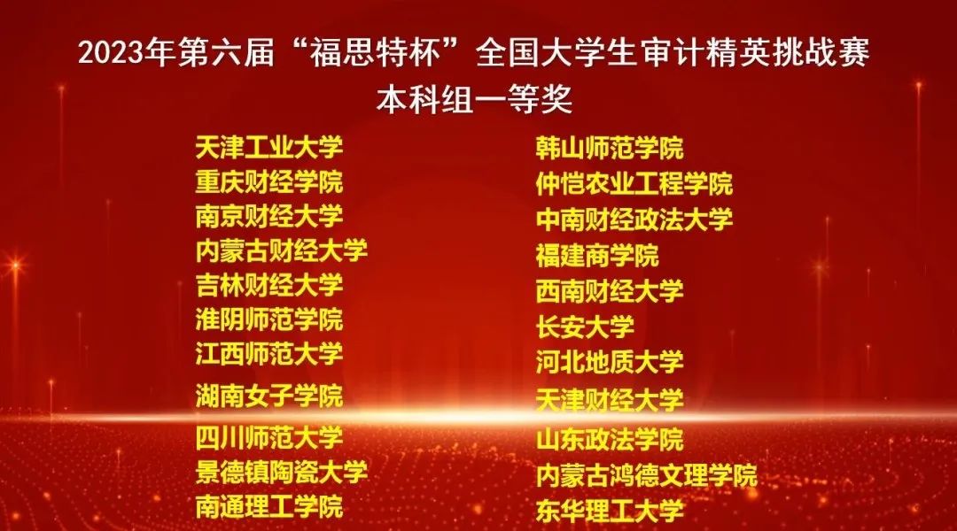 “福思特杯”全国大学生审计精英挑战赛是目前国内规模最大、赛道最全、参赛选手最多、规格最高的审计学科赛事。五年来,共有300所高校、近2万人参赛,并在2023年入选中国高等教育学会国家级赛事学科竞赛的观察目录。本次赛事由中国审计学会审计教育分会主办,南京审计大学政府审计学院承办,广州市福思特科技有限公司提供技术支持。大赛的成功举办,推动了我国审计专业教育的改革与创新,提高了学生的实践应用能力,推进了审计教育理念的改进,培养了适应社会经济发展需要的高素质专业化审计人才。(审核人 梁毕明)