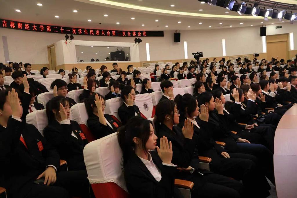 本次学代会筹备工作于今年9月正式启动,严格规范了学生代表、常任代表候选人及学生会主席团候选人的产生程序与资格审查。会议认真讨论并审议了学生会工作报告和学代会常任委员会工作报告。大会严格按照《中华全国学生联合会章程》及《吉林财经大学第二十一次学生代表大会选举办法》的有关规定,采取无记名投票方式,差额选举产生了工商管理学院黄子轩等5名同学为第四十七届学生会主席团成员,选举产生了语言文化学院王俊熹等17名同学为第四十七届学生代表大会常任委员会代表。