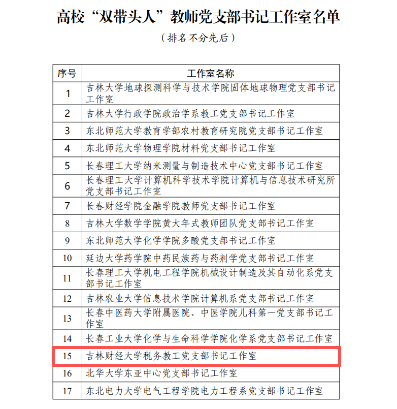 本网讯(税务学院 供稿)11月6日,吉林省教育厅发布《关于公布高校“双带头人 ”教师党支部书记工作室名单的通知》,我校税务学院税务教工党支部书记工作室入选全省高校“双带头人”教师党支部书记工作室。