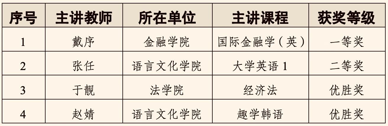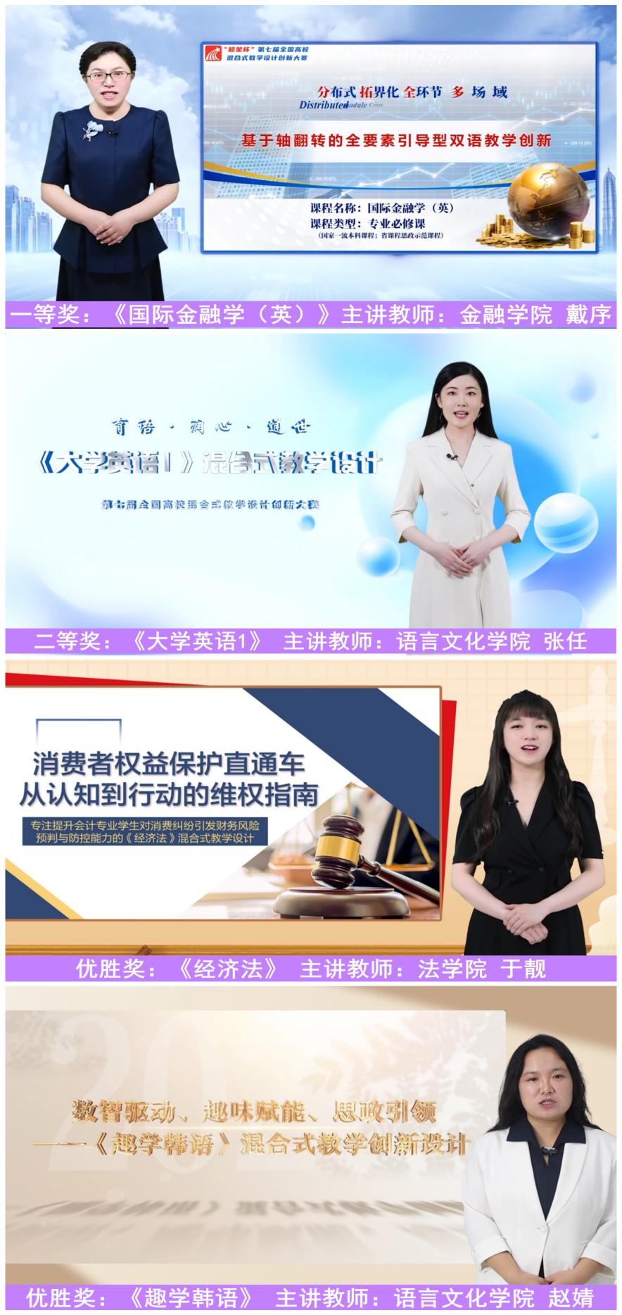 本网讯(教师教学发展中心 供稿)近日,在“超星杯”第七届全国高校混合式教学设计创新大赛上,我校金融学院戴序荣获一等奖,语言文化学院张任荣获二等奖,法学院于靓、语言文化学院赵婧等2位教师荣获优胜奖。