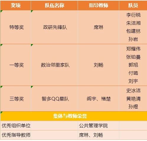 本网讯(公共管理学院 供稿)11月9日,在吉林省研究生公共管理案例大赛上,我校由席琳老师指导,李衍锐、朱洁湘、包建林、孙岩组成的政研先锋队荣获特等奖;由刘畅老师指导,郑耀伟、张铂曼、郭旭、付璐、刘宇组成的数治邻里家队荣获一等奖;由阎宇、褚楚两位老师指导,史冰洁、黄艳清、孙煜组成的智多QQ星队荣获三等奖;同时,公共管理学院荣获优秀组织单位奖,席琳、刘畅荣获优秀指导教师奖。