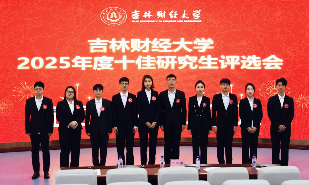 经现场评审,荣获我校2025年度“十佳研究生”的同学是:统计与数据科学学院董思雨、税务学院杨文凯、会计学院刘鑫晨、金融学院刘文科、管理科学与信息工程学院刘爽、公共管理学院邢鉴蔷、经济学院李震、法学院徐颢哲、国际经济贸易学院李云鹏、会计学院高菲。