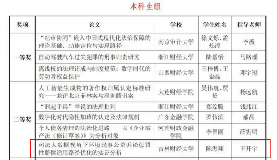 本网讯(法学院 供稿)近日,在第十七届全国财经高校法学教育论坛暨第十届全国财经高校法律职业技能大赛上,我校法学院学生李锦在王喆老师指导下撰写的《论资金分析报告真实性保障的全流程困境与破解路径》获大赛一等奖,陈海翔在王开宇老师指导下撰写的《司法大数据视角下环境民事公益诉讼惩罚性赔偿的适用路径优化的实证分析》获二等奖。