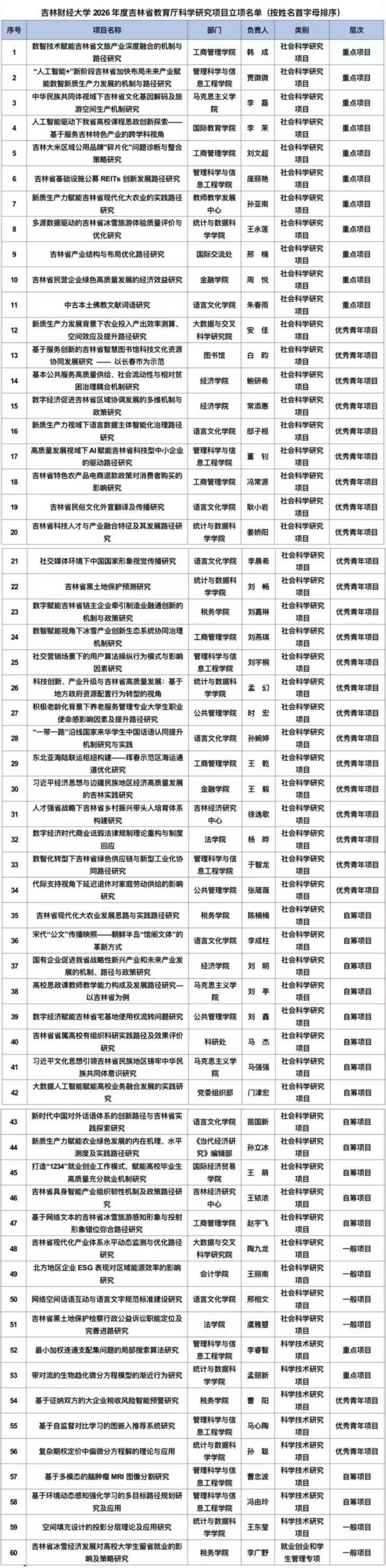 本网讯(科研处 供稿)近日,吉林省教育厅公布了2026年度吉林省教育厅科学研究项目立项名单,我校共有60项课题获批立项。其中重点项目13项、一般项目6项、优秀青年项目26项、自筹项目15项。获批项目数量创历史新高。