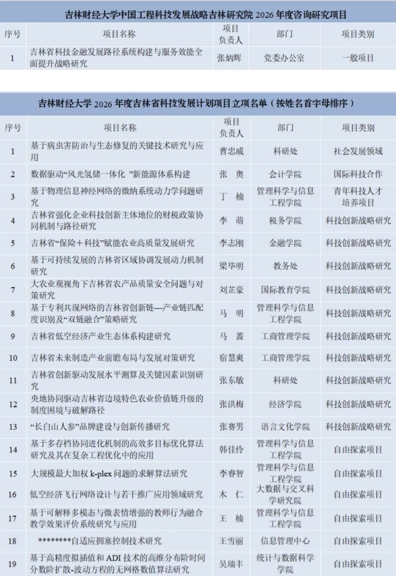 本网讯(科研处 供稿)近日,吉林省科技厅正式公布了2026年度中国工程科技发展战略吉林研究院项目和吉林省科技发展计划项目立项结果。由校党委书记张炳辉牵头申报的中国工程科技发展战略吉林研究院项目成功获批,另外有19项吉林省科技发展计划项目立项,立项总数较上一年度增长46%。其中,科技创新战略研究项目10项,自然科学基金(自由探索项目)6项,社会发展领域项目1项、国际科技合作项目1项,青年科技人才培养项目1项。我校在省科技厅社会发展领域类别和国际科技合作类别均为首次获批,自然科学基金(自由探索项目)立项数量显著增加,2026年度获批项目总经费达203万元,实现历史新高。