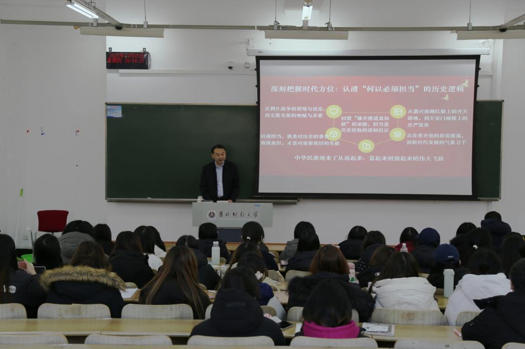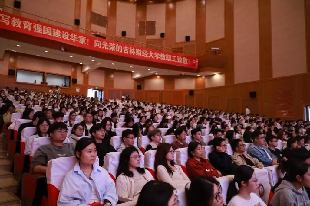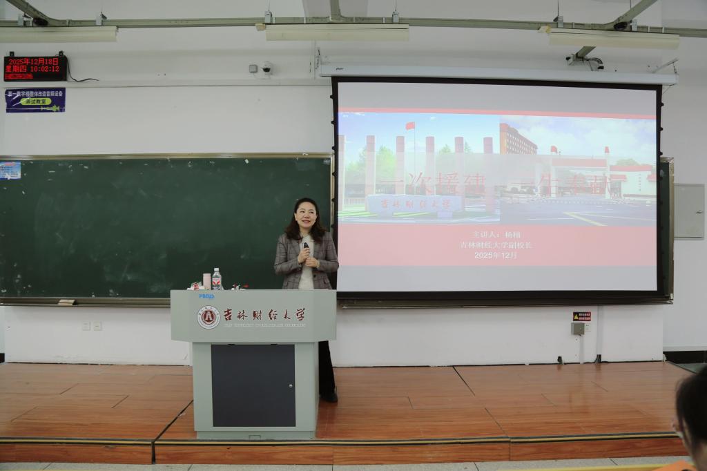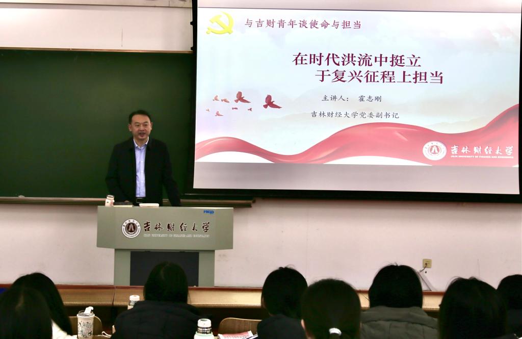 党委副书记霍志刚以《在时代洪流中挺立 于复兴征程上担当》为主题,从四个维度与新时代吉财青年畅谈使命与担当。他指出要深刻把握时代方位:认清“何以必须担当”的历史逻辑,精准锚定担当方向:明确“何以能够担当”的核心要求,自觉融入发展大局:找准“何以体现担当”的实践路径,赓续吉财红色血脉:书写“担当何以传承”的实干答卷。他以学校优秀校友的事迹勉励同学们,要以青年使命为指引,以红色校史为滋养,坚定理想信念、锤炼过硬本领、勇于担当作为,做新时代有理想、肯吃苦、勇担当的青年,用青春之我、奋斗之我,为全面建设社会主义现代化国家、全面推进中华民族伟大复兴贡献吉财力量。