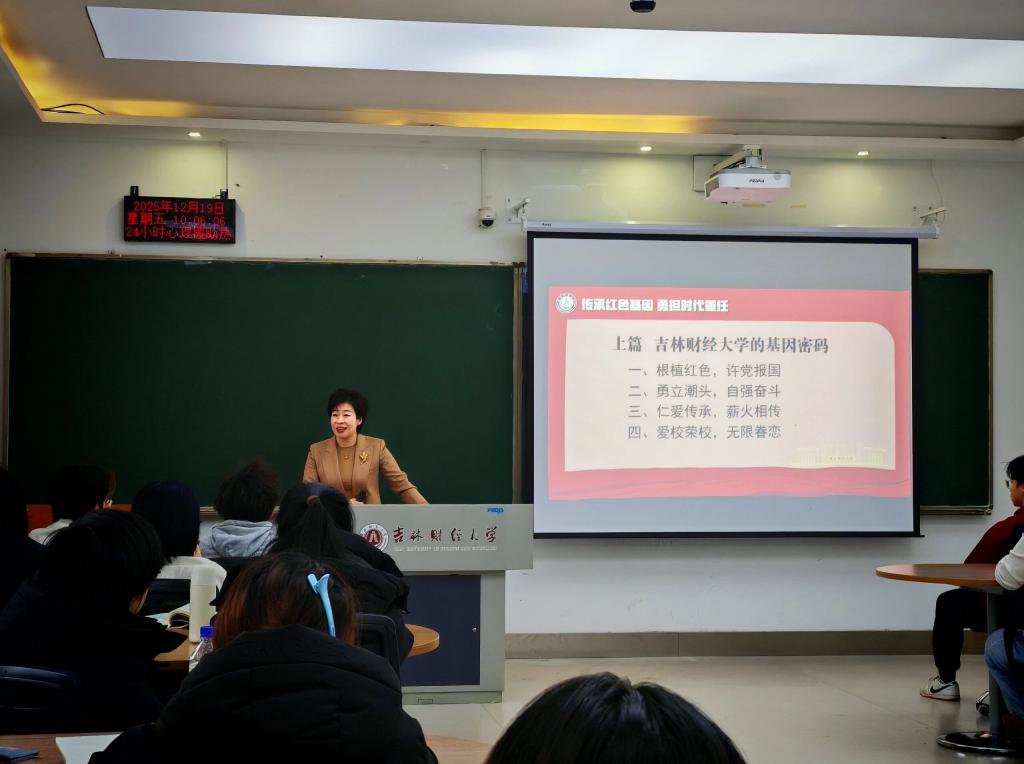 党委副书记李良以《传承红色基因 勇担时代重任》为主题,为国际经济贸易学院的学生上了一堂思政课。她围绕“吉林财经大学的基因密码”,结合历史纵深发展,回顾了吉林财经大学波澜壮阔的发展历程,清晰勾勒出学校 “红色基因” 凝聚的五种熠熠生辉的精神品质,即“根植红色,许党报国”的忠诚品格,“艰苦奋斗,自强不息”的优良作风,“明德崇实,经世济用”的求实品质,“仁爱奉献,薪火相传”的爱心文化,“勇立潮头、敢为人先” 的创新精神。李良将深刻的理论知识娓娓道来,既有对历史事件的旁征博引,又融入个人体悟与谆谆教诲,深入浅出地引导同学们思考“我们是谁、我们从哪里来、要到哪里去”的时代之问,殷切期望同学们要“拥抱朗润澄澈的大学生活”,能够在知史中爱校,在爱校中荣校,在荣校中报国,将个人的理想追求主动融入党和人民的宏伟事业之中。