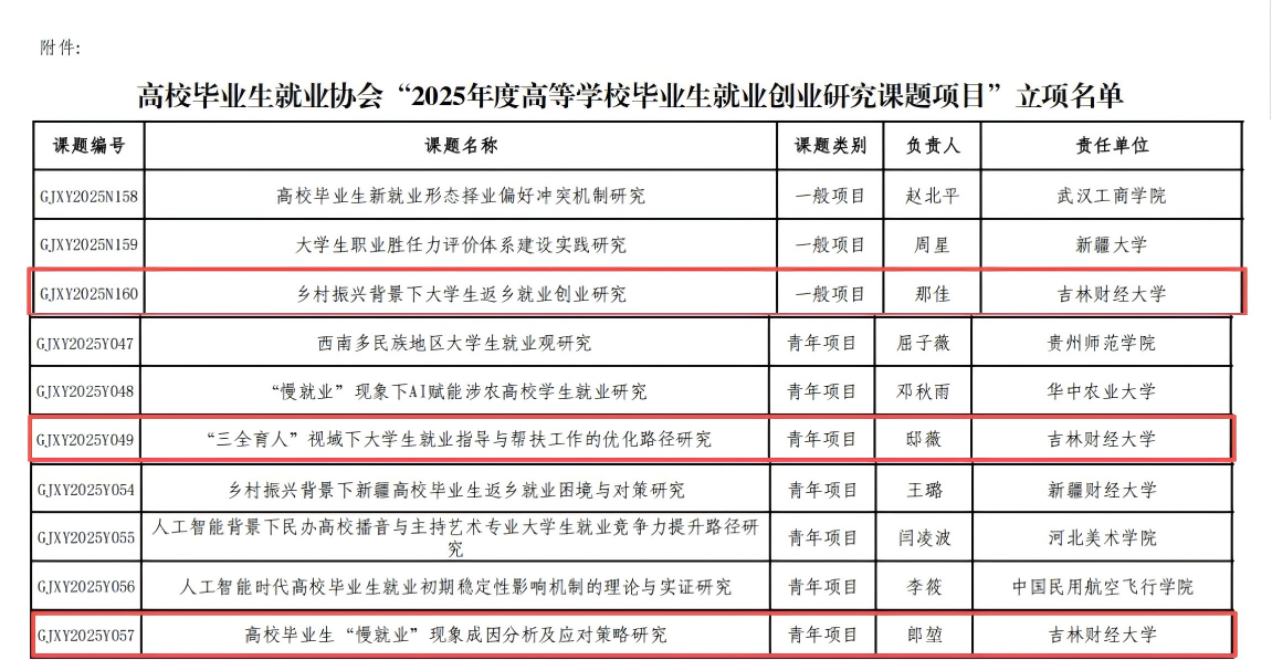 高校毕业生就业协会是由教育部主管的国家一级社会团体,其设立的高校毕业生就业创业研究课题具有较高学术权威性,按《全国教育科学规划课题管理办法》实施管理,并被广泛认可为省部级科研项目。据悉,本次全国共立项课题274项,包括重大课题2项、重点课题19项、一般项目183项、青年项目70项。吉林省共有3所高校立项课题5项,我校获得3项课题立项,展现了在就业创业研究领域的扎实积累与创新活力。