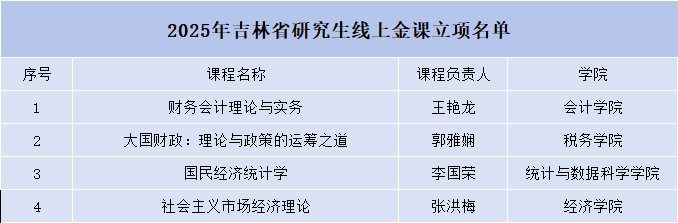 本网讯(研究生学院 供稿)近日,吉林省教育厅公布了首批研究生线上金课认定名单,我校共有4门课程成功入选,涵盖理论经济学、应用经济学、统计学、工商管理学等优势学科领域。