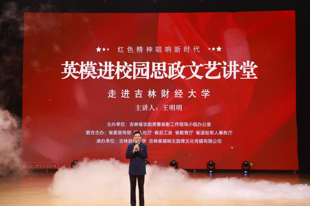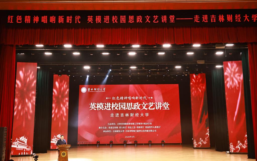 张炳辉指出,在全省深入学习贯彻全国两会精神、奋力推进 “十五五” 规划开局的关键节点,学校承办此次英模进校园思政文艺讲堂意义重大。活动紧扣 “大思政课” 建设要求,把红色基因传承、英模精神弘扬与高校立德树人根本任务深度融合,是浸润心灵的红色思政大课和凝聚力量的青春思想洗礼。他指出,本次活动邀请王明明教授带来特色红色宣讲,也迎来多位英模代表进校园,英模是时代榜样与青年楷模,他希望全体师生从红色精神和英模事迹中汲取奋进力量,将崇敬之情转化为实际行动,坚定信念、勤学笃行,努力成长为堪当民族复兴重任的时代新人,为国家现代化建设、吉林全面振兴取得新突破贡献吉财智慧与青春力量。张炳辉表示,学校会持续深化英模精神学习宣传,引导广大师生从英模精神中汲取奋进力量,把爱国情、强国志、报国行融入学习工作中,为国家现代化建设,为吉林高质量发展明显进位、全面振兴取得新突破贡献吉财智慧与青春力量。