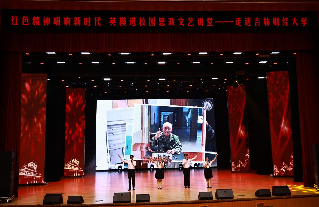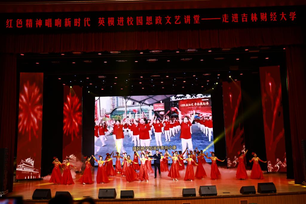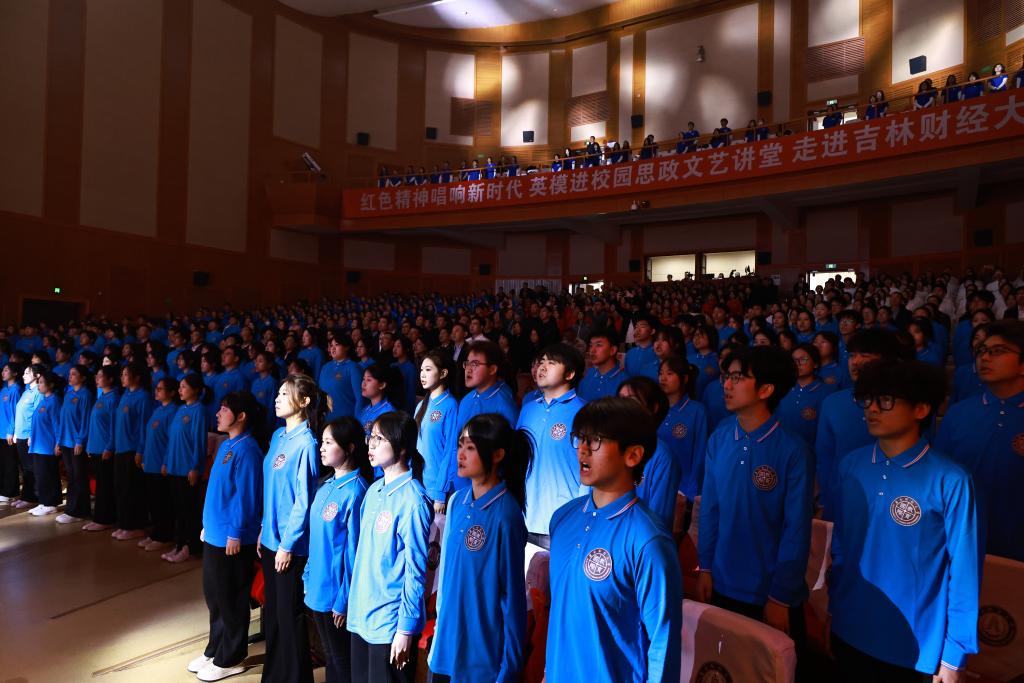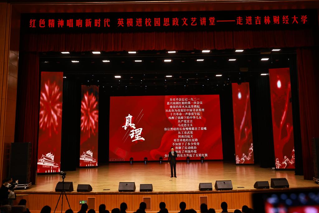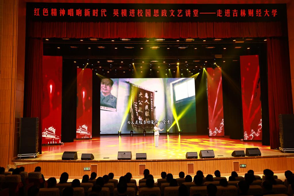 活动以红歌为媒、英模为范,将红色思政教育与财经高校人才培养深度融合。第四届全国中青年德艺双馨文艺工作者、吉林工商学院教授、吉林财经大学美育专家顾问王明明教授倾情演绎了一堂集“讲、唱、诵、互动”于一体的沉浸式红色思政课,让现场师生在红色旋律与英模故事中感悟初心使命,厚植家国情怀。