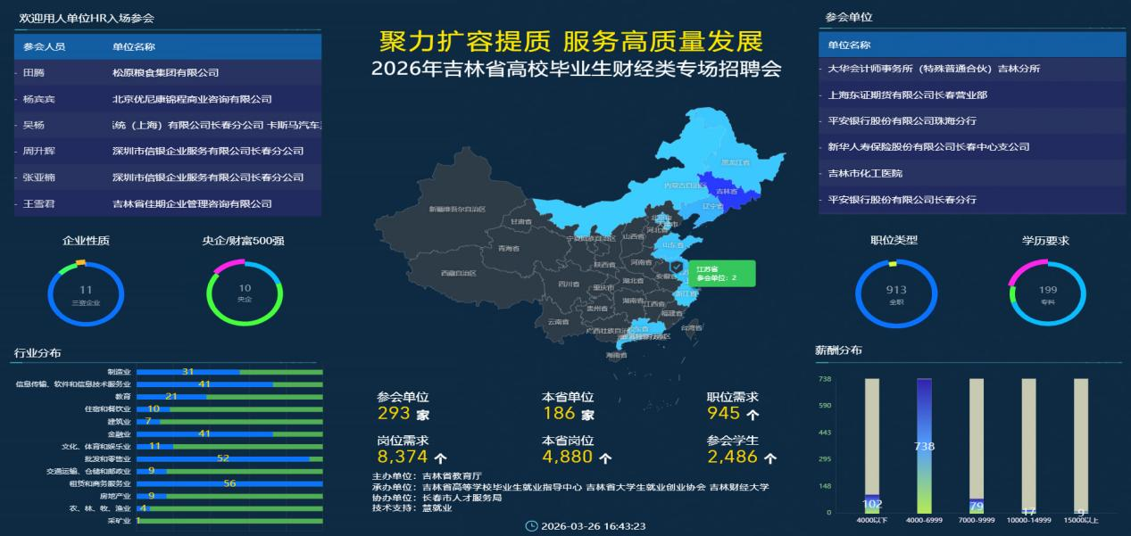 本次招聘会由吉林省教育厅主办,我校与吉林省高等学校毕业生就业指导中心、吉林省大学生就业创业协会承办,长春市人才服务局协办,吸引了中铁十八局集团有限公司、平安银行股份有限公司长春分行、中信证券股份有限公司吉林省分公司等293家用人单位参会,其中省内单位186家,涵盖财会、金融、税务咨询、教育、法律、信息科技等多个领域,提供就业岗位8300余个,省内岗位4800余个,我校及吉林省财经类院校创新发展联盟成员单位的2400余名毕业生参会。