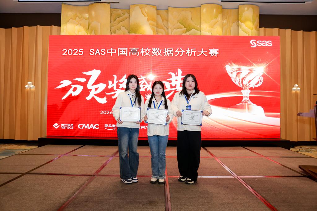 本网讯(统计与数据科学学院 供稿)近日,在2025 SAS中国高校数据分析大赛全国总决赛中,我校统计与数据科学学院两支研究生团队在王永莲老师的指导下表现优异,由靳佳萱、李雅轩团队完成的《基于机器学习模型分析金属期货数据》荣获全国总决赛特等奖第四名,由赵颖影、刘科言、杜桐团队完成的《以INHANCE试验为例解析临床试验适应性设计与分析》荣获一等奖,学校同时获评最佳组织奖。
