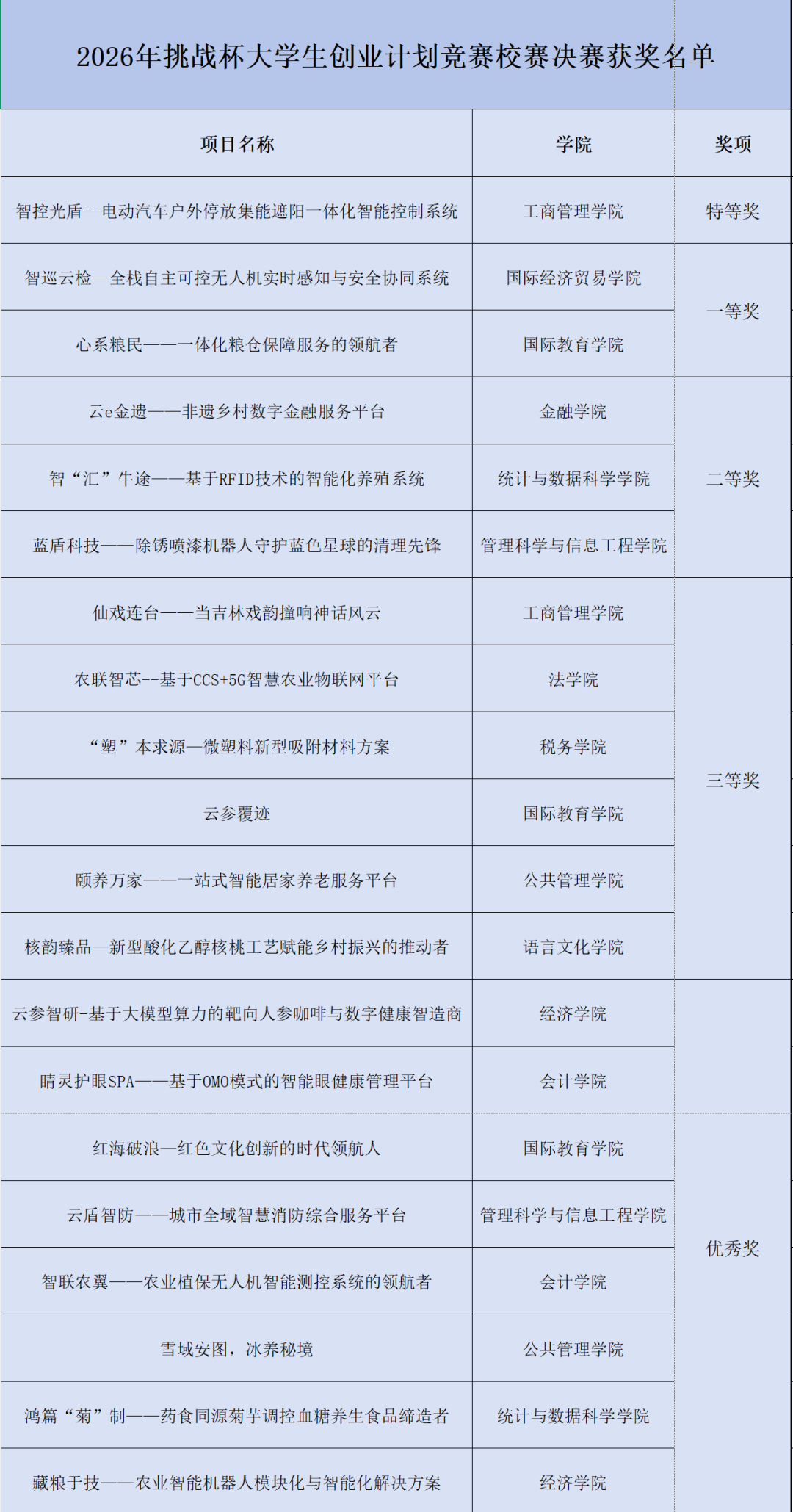 经过激烈角逐,工商管理学院《智控光盾--电动汽车户外停放集能遮阳一体化智能控制系统》项目获得特等奖;国际经济贸易学院《智巡云检—全栈自主可控无人机实时感知与安全协同系统》、国际教育学院《心系粮民——一体化粮仓保障服务的领航者》等2个项目获得一等奖;金融学院《云e金遗——非遗乡村数字金融服务平台》、统计与数据科学学院《智“汇”牛途——基于RFID技术的智能化养殖系统》、管理科学与信息工程学院《蓝盾科技——除锈喷漆机器人守护蓝色星球的清理先锋》等3个项目获得二等奖;工商管理学院《仙戏连台——当吉林戏韵撞响神话风云》、法学院《农联智芯--基于CCS+5G智慧农业物联网平台》、税务学院《“塑”本求源—微塑料新型吸附材料方案》、国际教育学院《云参覆迹》、公共管理学院《颐养万家——一站式智能居家养老服务平台》、语言文化学院《核韵臻品—新型酸化乙醇核桃工艺赋能乡村振兴的推动者》等6个项目获得三等奖。经济学院《云参智研-基于大模型算力的靶向人参咖啡与数字健康智造商》、会计学院《睛灵护眼SPA——基于OMO模式的智能眼健康管理平台》等8个项目获得优秀奖;其他入围决赛的30个项目获得挑战之星奖。