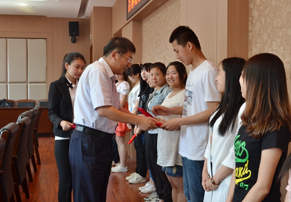 本网讯(学生记者 葛粉利)6月4日下午,我校在综合楼第二会议室举行了第九届吉财“菁华”助学基金发放仪式。我校84级校友、青岛校友会秘书长、吉财“菁华”助学基金理事会秘书长、中信万通证券有限责任公司董事会高级副总裁周建宁代表吉财“菁华”助学基金会向15位获得助学基金的同学发放了助学金。校党委副书记邹永亮、校学生工作处处长袁贵成、税务学院郉树东教授参加了发放仪式。仪式由校学生资助管理中心副主任桑学江主持。