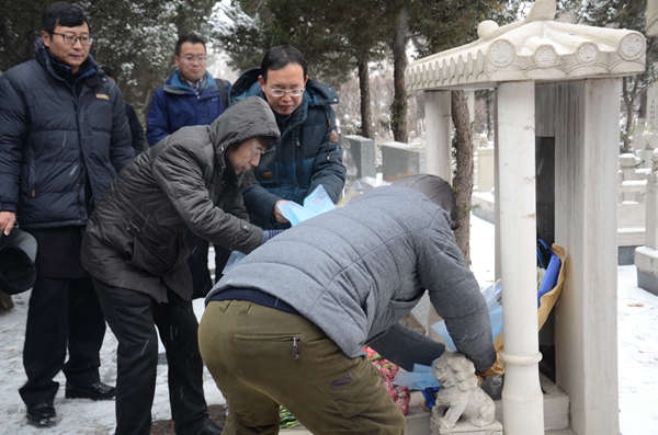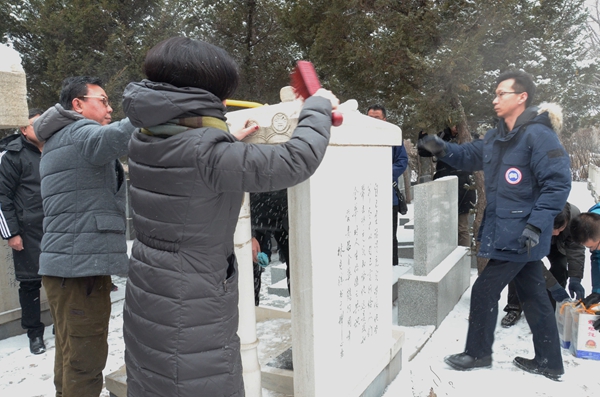 上午9点30分,参加祭扫的毕业学生记者来到吕金华老师墓前默哀,表达对吕老师的深切怀念。随后,大家仔细清扫了墓碑上的积雪和灰尘,并逐一献花、祭酒。随后,我校首届大学生记者团团长、沈阳《华商晨报》社长兼总编刘庆诵读了《祭恩师歌》。