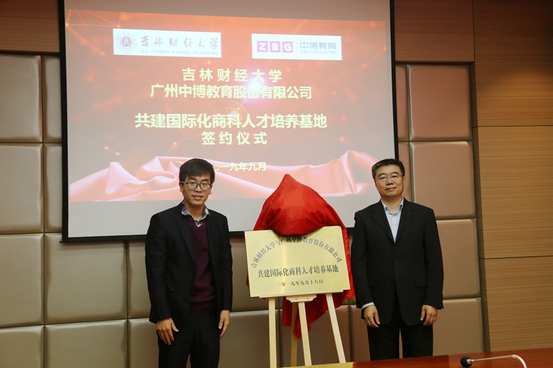 最后,副校长刘鹤教授与中博教育股份有限公司副总裁李波先生共同签署《吉林财经大学与广州中博教育股份有限公司共建国际化商科人才培养基地战略合作协议》并为基地揭牌。