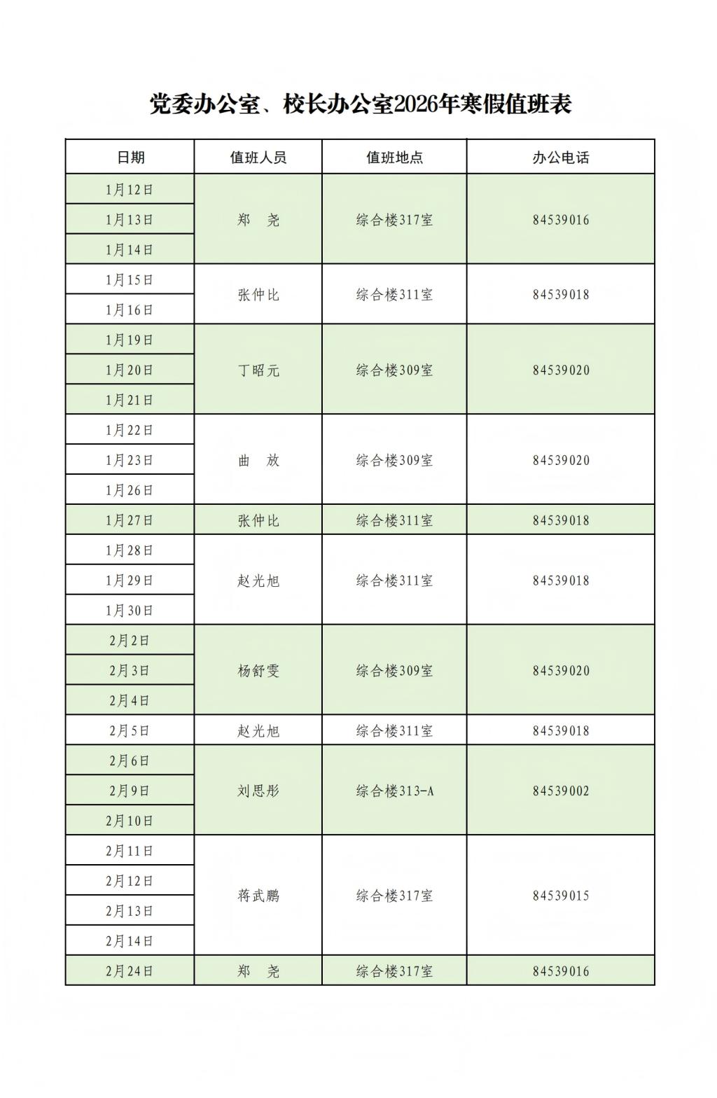 党委办公室、校长办公室2026年寒假值班表