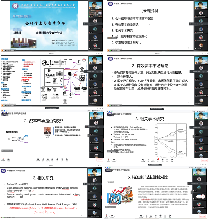 本网讯(会计学院 供稿)疫情特殊时期,为丰富和充实研究生业余活动和提升科研水平,吉林财经大学会计学院举行青年博士系列专题讲座,3月24日下午18:00,由吉林财经大学会计学院国际会计系胡玮佳老师以线上腾讯会议的方式为我院学生作主题为“会计信息与资本市场”的学术报告。该次会议由吉林财经大学会计学院副院长王丽南老师主持,会计学院2020、2021级全日制研究生以及部分本科生总计三百余人共同参与聆听。