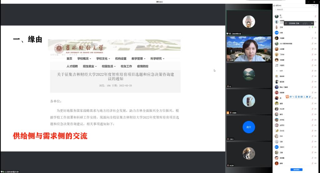 本网讯(国际经济贸易学院 供稿)为响应我校征集智库培育项目选题和应急决策咨询建议的号召,提高教师撰写决策咨询报告的能力和水平,3月30日晚,应国际经济贸易学院邀请,中共吉林省委决策咨询办秘书处王涛处长,通过腾讯会议为学院师生作了题为“如何撰写好决策咨询报告”的学术报告。本次报告会由国际经济贸易学院副院长关嘉麟教授主持。