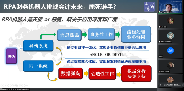 首先,程平教授通过介绍重庆理工大学的教师团队、近年来教育成果、RPA财务机器人课程教学探索历程、相关学术成果以及沙盘推演、案例分析和软件实验等应用场景,引出本次报告主题。程教授认为,财务机器人引发了财务的新变革,表现为RPA对于会计工作的影响、RPA对于审计工作的影响,列举集团企业FSSC中的RPA机器人应用和对RPA的误解和极端认识,并据此指出会计人应该如何应对RPA挑战。接着,程平教授为大家介绍财务机器人的功能以及其为企业带来的主要价值,包括效率与成本、效能与质量以及风险与合规等方面,并运用金蝶软件演示差旅费数据分析和RPA审计机器人工作流程、基本功能、应用场景等。最后,程平教授表明RPA财务机器人的作用取决于应用深度与广度,其可以通过业财技一体化,实现企业价值链业务合纵连横,也可以通过数据生态化反,实现企业价值链决策精益求精。(审核人 梁毕明)