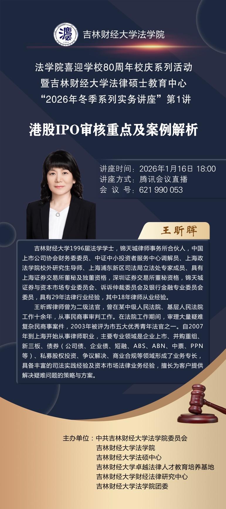 本期系列讲座共五讲,分别邀请了吉林财经大学1996届法学学士、上海市锦天城律师事务所合伙人王昕晖,1997届法学学士、大成昆明分所高级合伙人宋云苍,2010届法学学士、长春市中级人民法院四级高级法官孙振霆,2013届法学学士、北京安博(成都)律师事务所合伙人钱力,2019届法律硕士、北京盈科(长春)律师事务所律师郑宝磊主讲,以“港股IPO实务及案例分享”“刑事辩护中如何拆解和重构案件事实”“重大刑事犯罪(侵犯人身权利类)解析与防范”“公司债权人利益保护之追索股东责任实战应用”“透视自首的24个维度”为题展开。