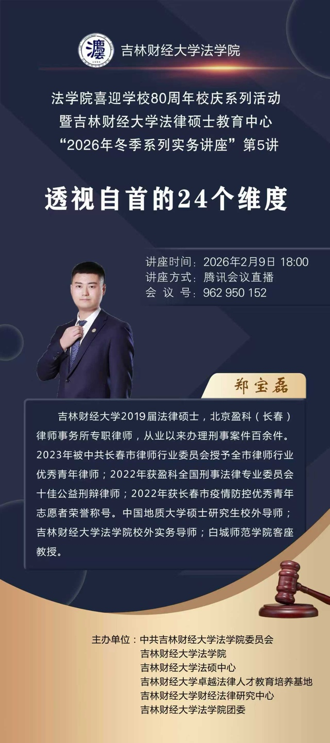 本网讯(法学院 供稿)1月16日至2月9日,法学院举办喜迎学校80周年校庆系列活动暨吉林财经大学法律硕士教育中心“2026年冬季系列实务讲座”。