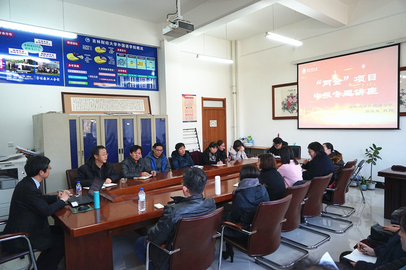 本网讯(外国语学院 供稿)11月29日,应我校外国语学院邀请,吉林大学外国语学院院长、教授、博士生导师周异夫教授为外国语学院教师作了“两金”项目申报专题报告,报告由外国语学院院长刘曙野教授主持。