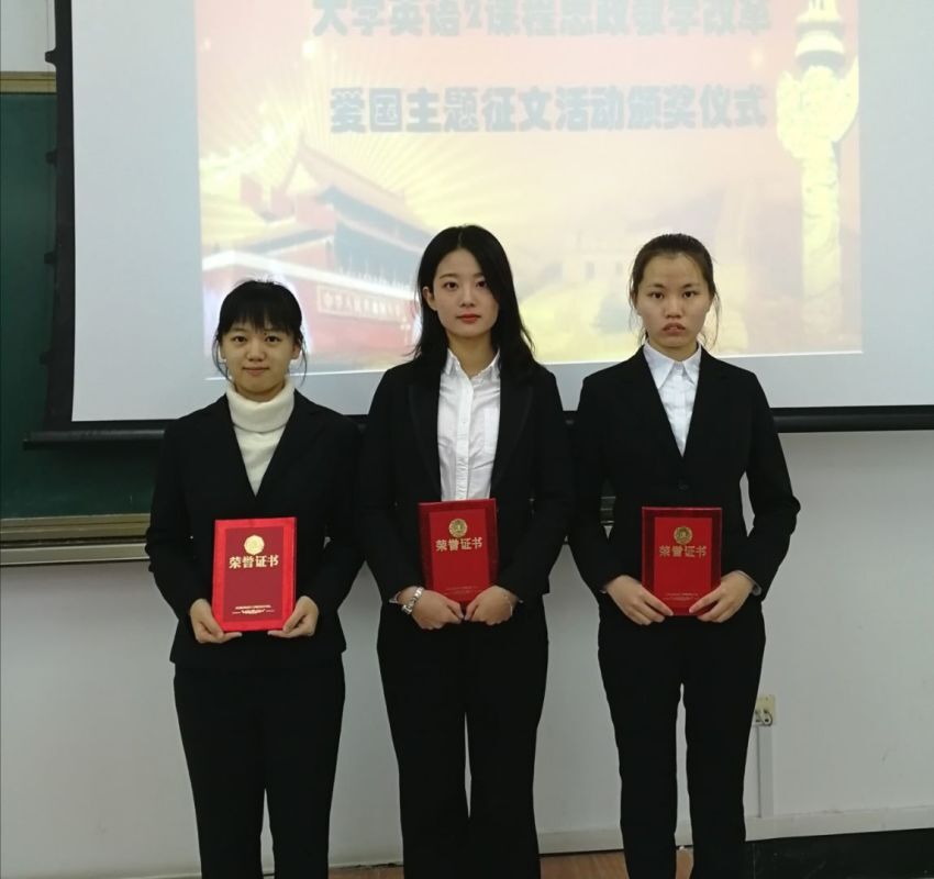 2019年是祖国70岁华诞,课题组依托批改网在2019年10月到12月间举办了“My Present for the 70th Birthday of My Country”《我为祖国70岁生日献礼》英语征文活动。活动得到了外语部全体教师的积极响应,在大一、大二两个年级中得到广泛的推广,课题组收到征文近千份。课题组采用机器阅卷与人工阅卷相结合的双评审模式,人工阅卷又采用了多人评阅取平均分的办法,最终评选出了一批文采飞扬、饱含深情的优秀爱国主题作品并给予了奖励。在众多选手中,崔涵、刘娴、肖池3位同学脱颖而出获得一等奖;王浩宴等5位同学获得二等奖;另有20位同学分别获得三等奖和优秀奖。征文活动大大提升了学生们的爱国意识和民族自豪感。