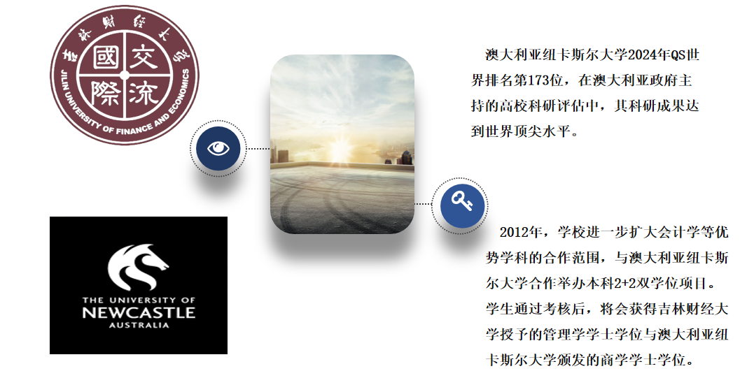 随着我校中外合作办学项目的高质量发展,2012年,学校进一步扩大会计学等优势学科的合作范围,与澳大利亚纽卡斯尔大学合作举办本科2+2双学位项目。项目学生本科期间1-2年级在我校学习,3-4年级在澳大利亚纽卡斯尔大学就读。中澳双方学校互认学分,学生通过考核后,将会获得吉林财经大学授予的管理学学士学位与澳大利亚纽卡斯尔大学颁发的商学学士学位。